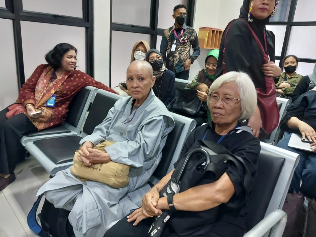 Wiwin Haryono (kiri) dan Kamala Chandrakirana (mantan ketua Komnas Perempuan) di sela Sidang Gugatan Penyangkalan Menteri Kebudayaan Fadli Zon terkait dengan Perkosaan Mei 1998 di Pengadilan Tata Usaha Negara (PTUN)