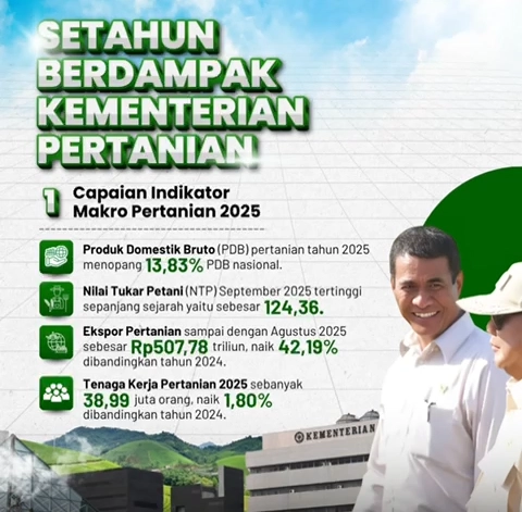 Menteri Pertanian Andi Amran Sulaiman menyampaikan capaian ekspor, NTP, dan penurunan harga pupuk mencerminkan keberhasilan kebijakan prioritas kementerian selama setahun terakhir.